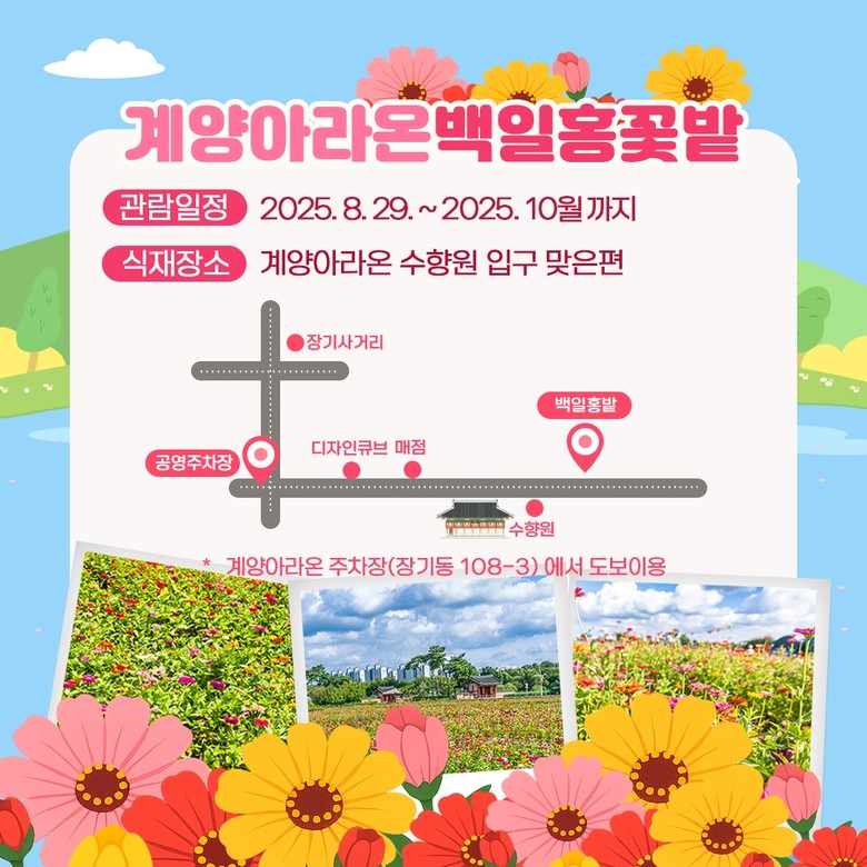 [계양구 세계타임즈=심하린 기자] 인천광역시 계양구(구청장 윤환)는 계양아라온에 가을의 정취를 더할 24,979㎡(약 7,550평) 규모의 백일홍 꽃밭을 조성해 8월 29일부터 시민들을 맞이한다고 밝혔다.