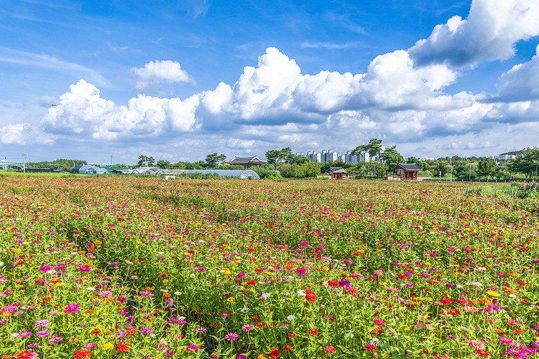 올여름 푸른 청보리밭으로 시원한 풍경을 선사했던 자리에, 이제는 붉게 물든 백일홍이 계절의 변화를 알리고 있다. 백일홍은 지난 6월 파종을 시작으로 7~8월의 뜨거운 여름을 견뎌내며 꽃망울을 틔웠다. 지금은 2천만 송이의 다채로운 빛깔을 자랑하며 은은한 향기와 함께 시민들에게 이른 가을 인사를 전하고 있다.