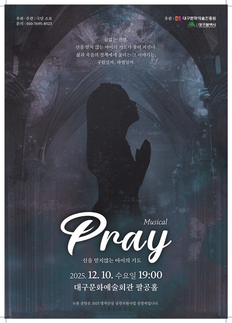▸ 지오뮤직(GO MUSIC) ‘CARNIVAR – THE MASK’ / 12월 3일(수), 소묘 ‘뮤지컬 < PRAY > - 신을 믿지 않는 아이의 기도’ / 12월 10일(수) [세계타임즈=대구 한윤석 기자] 대구문화예술진흥원 문화예술본부는 ‘2025년도 지역문화예술지원사업 명작산실공연지원’을 통해 최종 선정된 두 단체의 본공연을 오는 12월 3일(수/19시 30분), 12월 10일(수/19시) 각각 대구문화예술회관 팔공홀에서 선보인다.