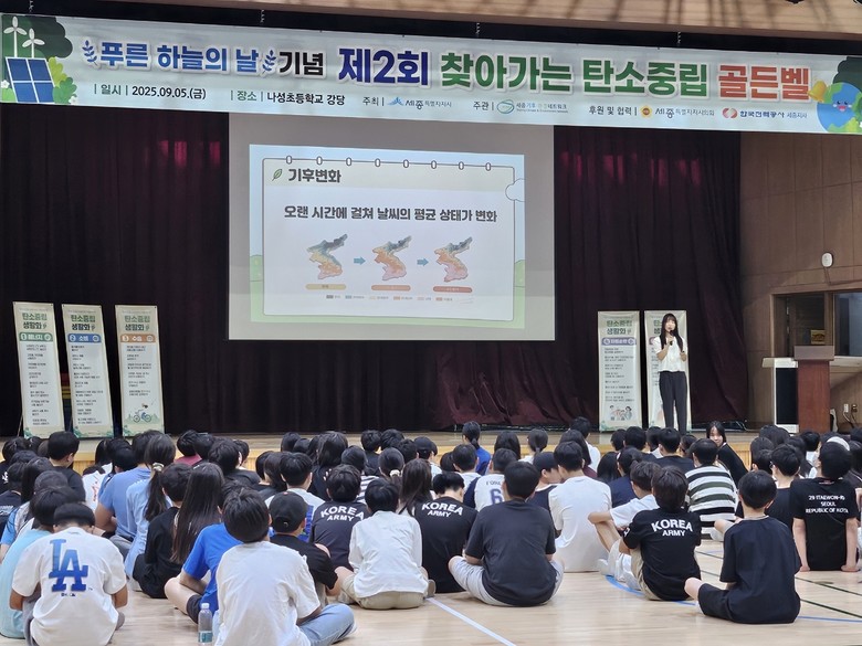 [세종 세계타임즈=이채봉 기자] 세종특별자치시(시장 최민호)가 5일 나성초등학교 강당에서 세종기후·환경네트워크(상임대표 손경희)와 함께 ‘찾아가는 탄소중립 골든벨’을 개최했다.