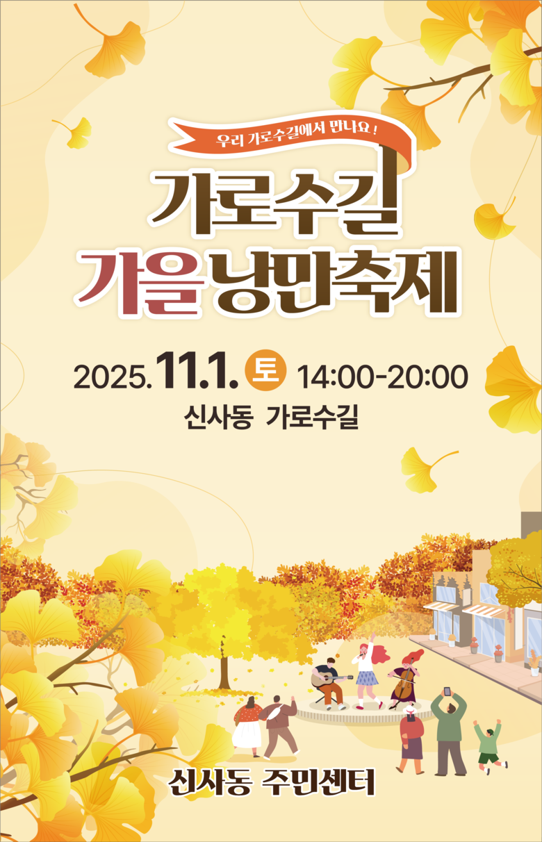 이태호 신사동장은 “가로수길 가을 낭만축제는 지역 주민과 상인, 방문객이 함께 참여하는 은은하고 가을 감성 넘치는 지역축제로 만들겠다”며 “많은 분이 찾아오셔서 일상에 낭만을 더해주는 ‘작은 쉼표’를 발견하시길 바란다”고 말했다.