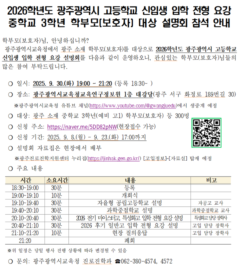 설명회 참여 신청은 오는 23일까지 온라인(https://naver.me/5DD82pNW)으로 하면 된다. 현장 접수도 가능하며, 행사에 참석하지 못하는 학부모를 위해 시교육청 유튜브 채널(@gwangjuedu)을 통해 실시간 중계할 예정이다.
