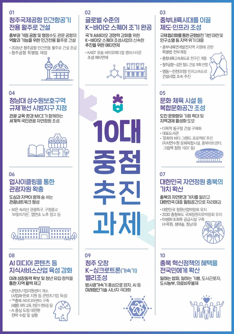 10대 핵심 성과에 이어, 김영환 지사는 “지역경제와 민생이 어려운 지금 지난 3년의 성과를 바탕으로 지역 경제의 성장동력과 민생활력을 끌어올릴 10대 중점 추진과제를 선정하여 도정의 역량을 집중해 나가겠다..”라고 발표했다.