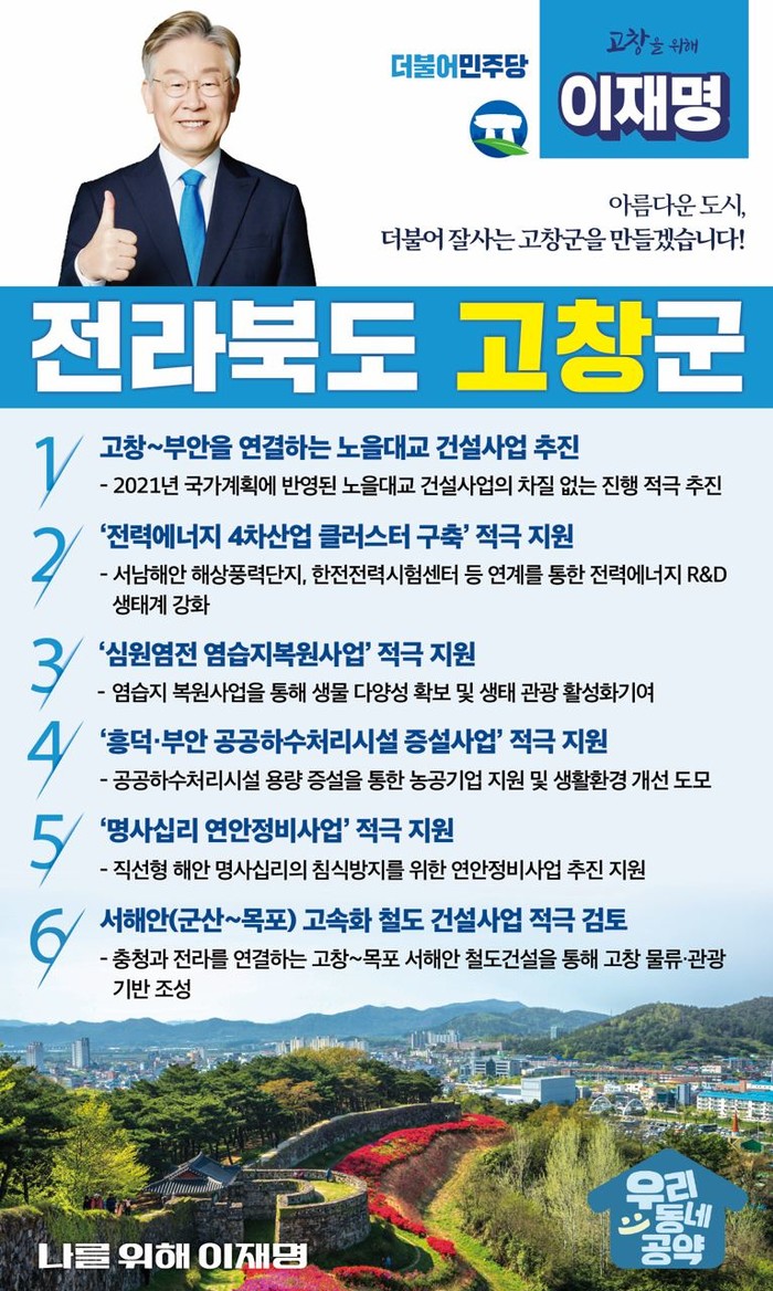 ‘우리동네공약’에 반영된 고창군 주요 공약은 △ 노을대교(고창~부안) 건설사업(국도 77호선)의 조속한 추진, △ 전력에너지 4차산업 클러스터 구축, △ 심원염전 염습지 복원, △ 흥덕·부안 공공하수처리시설 증설, △ 명사십리 연안정비, △ 서해안(군산~목포)고속화철도 건설 적극 검토 등 총 6건이다.