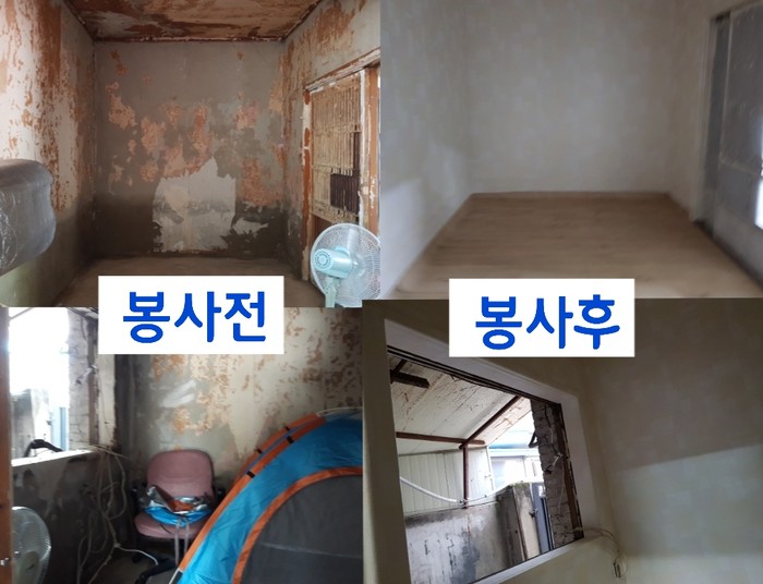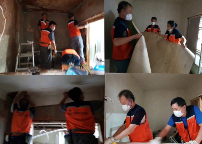 이날 봉사는 장인들 도배학원 김정자 원장을 비롯해서 자원봉사 7명이 지난 태풍으로 수해를 당한 1층 상가세입자의 주거시설에 도배와 장판 교체 봉사를 하였다.