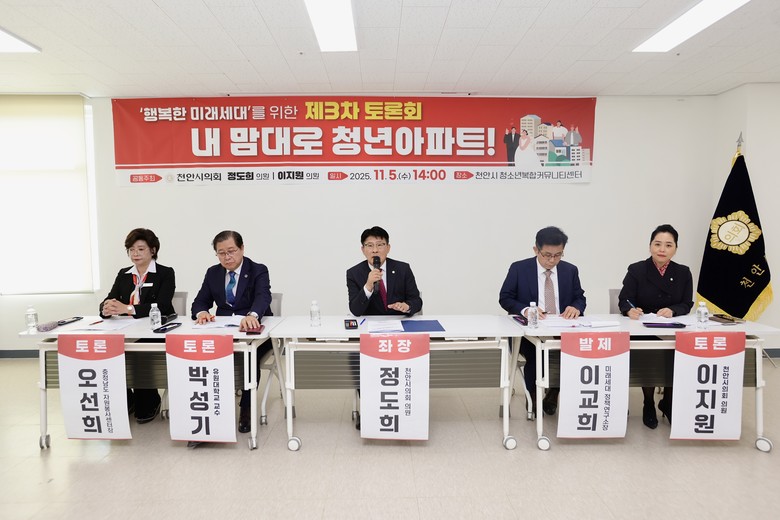 [천안시 세계타임즈=이현진 기자] 천안시의회(의장 김행금)는 5일(수) 오후 2시 천안시 청소년복합커뮤니티센터 다목적실에서 정도희 의원(국민의힘, 불당1·2동)과 이지원 의원(국민의힘, 성거읍·부성1동)이 공동 주최한 ‘행복한 미래세대를 위한 제3차 토론회’를 개최했다.