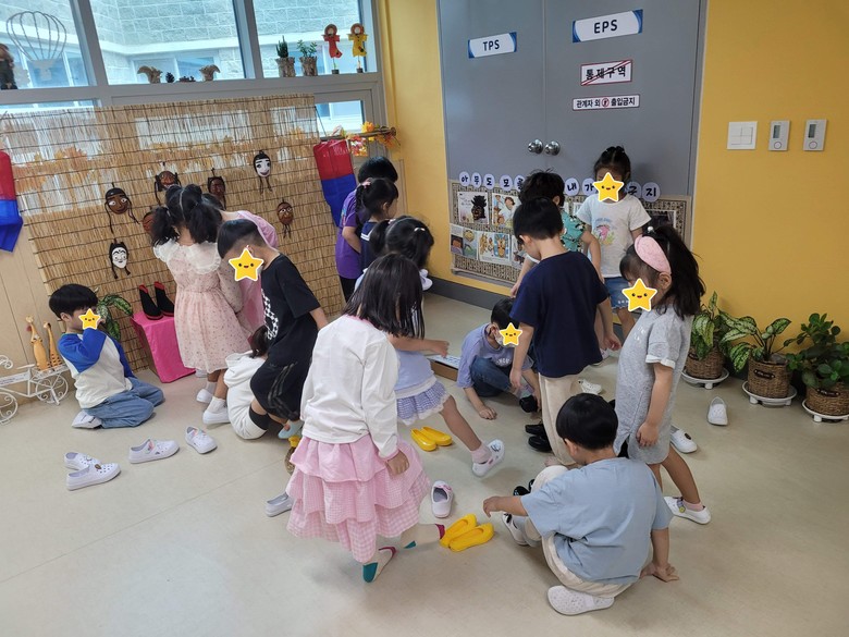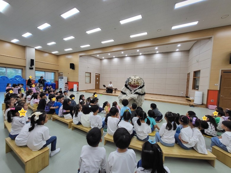 이번 체험 또한 일시적이고 단편적인 전통문화 체험활동에 그치지 않고 유아 스스로 놀이에 몰두하고 집중하는 놀이가 지속될 수 있도록 교실 외에도 옛날 물건 전시 공간 등으로 심화, 확장하여 복도, 특별실, 실외 등 다양한 장소에서 유아들이 여러 방법으로 직접 체험할 수 있도록 하였다. 더불어 2023 한~판 놀자! 활동의 일환으로 기획한 전래동화「줄줄이 꿴 호랑이」동화 구연극 공연팀을 초빙하여 전통악기 연주, 장단과 가락 익히기, 사자춤 공연 관람 활동을 통해 문화예술 공연 관람의 통합적 기회를 가졌다.