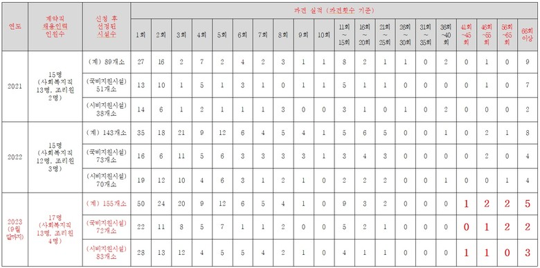 ◈ 특정 10개 시설은 40회 이상, 특정 5개 시설은 66회 이상이나 대체인력 지원받아!