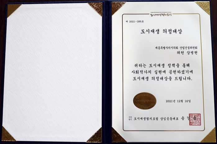 상 의원은 “도시재생의 지향점인 사람 중심의 도시를 조성하는 일은 살기 좋은 도시를 만드는 노력의 일환인 만큼 이번 수상을 계기로 주민들과 함께 지역 균형발전과 상생의 가치를 실현하는 도시를 만드는 데 최선을 다하겠다”고 말했다.