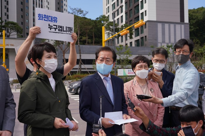 홍 후보는 “제가 대통령이 되면 칼잡이 대통령이 되지 않으려 했다. 정치보복을 안하겠다고 했지만 (화천대유 사건은) 서민들의 피를 빨아먹는 거머리 떼들의 문제다. 회사이름에서부터 대선 프로젝트였다”며 “철저히 파헤쳐서 (부당이익을) 전부 공공에 환수해야한다. 그냥 둘 수 없다”고 주장했다.