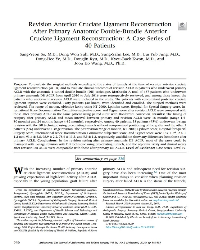 이번 연구는 전방십자인대 재건술 후 재파열된 경우 시행하는 ‘전방십자인대 재재건술’ 수술법 관련 논문으로, 전방십자인대 재재건술은 1차 재건술에 비해 골터널 확장 등으로 인해 수술이 까다롭고 임상 결과가 좋지 않은 것으로 알려져 있었다. 또한 이중다발 전방