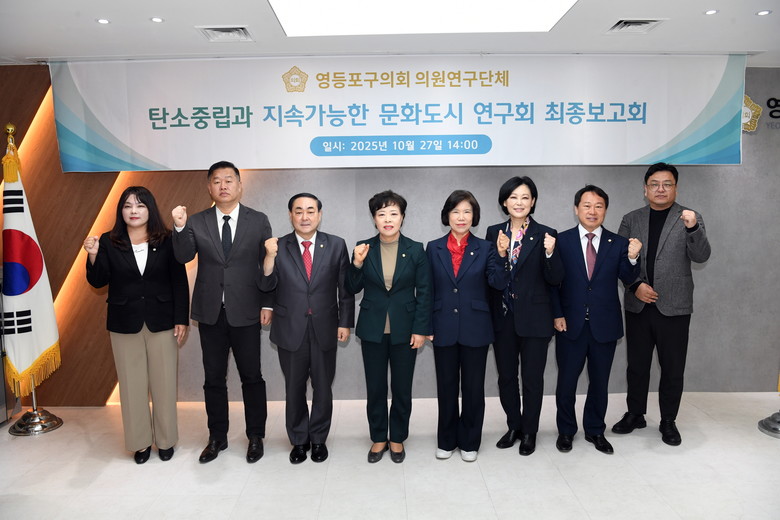 [영등포구 세계타임즈=이장성 기자] 영등포구의회 의원연구단체 '탄소중립과 지속가능한 문화도시 연구회'가 10월 27일 오후 2시 영등포구의회 다목적회의실에서 최종보고회를 개최하고 올해 연구활동을 마무리했다.
