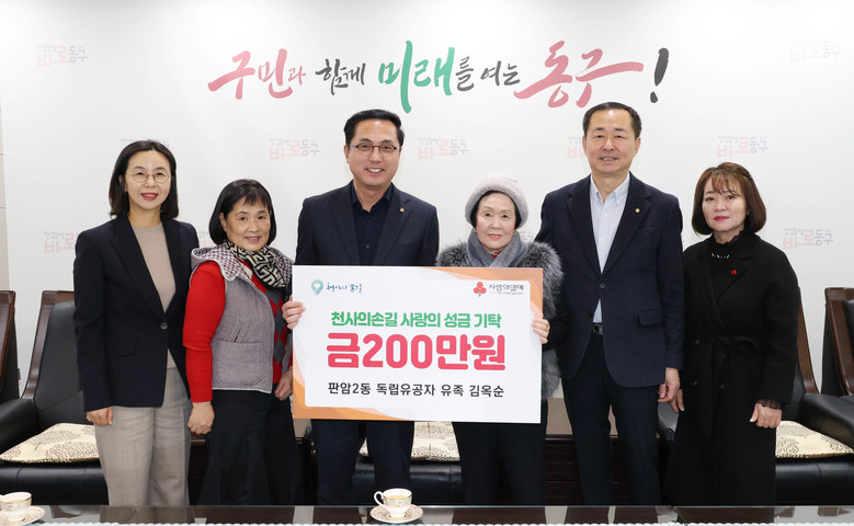 [동구 세계타임즈=이채봉 기자] 대전 동구(구청장 박희조)는 판암2동에 거주하는 독립유공자 후손 김옥순 씨(83)가 지역 내 어려운 이웃을 돕기 위해 성금 200만 원을 기탁했다고 12일 밝혔다.
