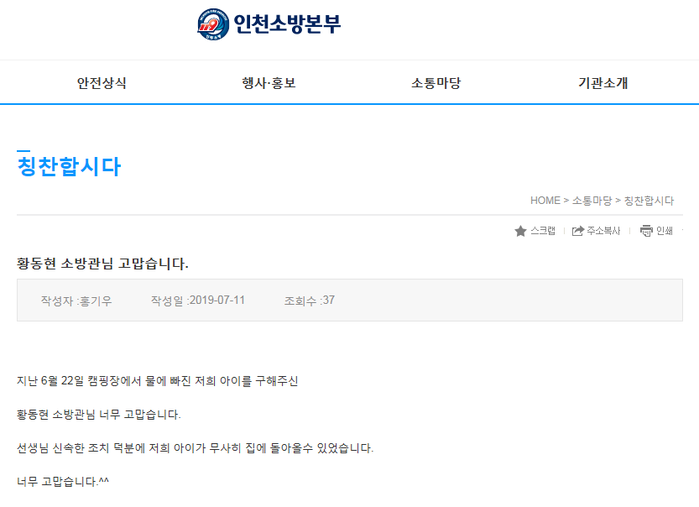 13일 송도소방서에 따르면 지난 6월 22일 강원도 영월의 한 캠핑장 야외수영장에서 물놀이를 하던 4세 남자아이가 물에 빠졌다. 이때 마침 주변에 있던 인천송도소방서 황동현 소방장은 물에 빠진 아이를 구조하여 의식과 맥박, 호흡이 없는 아이에게 심폐소생술을 실시, 현장 출동한 영월소방서 주천119안전센터 구급대에게 인계하였다.