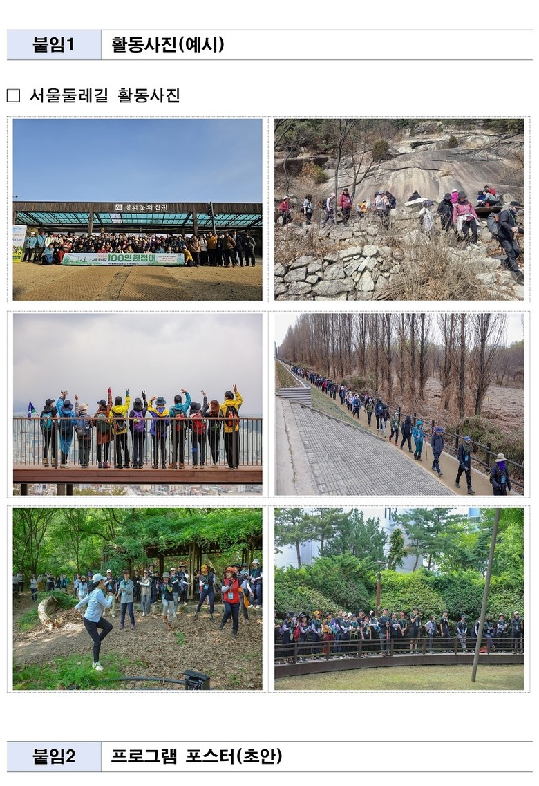 모집은 2월 20일(금)부터 3월 2일(월)까지 진행되며, 서울둘레길 156.5㎞를 주변의 도움 없이 완주할 수 있는 국민이라면 누구나 신청할 수 있다. 총 100명을 선발하며(자체선발 30명, 일반선발 70명), 구글폼을 통해 신청 받는다. 구글폼은 서울의공원누리집과 서울둘레길 누리집에서 확인할 수 있으며 포스터의 QR코드로 신청할 수 있다.