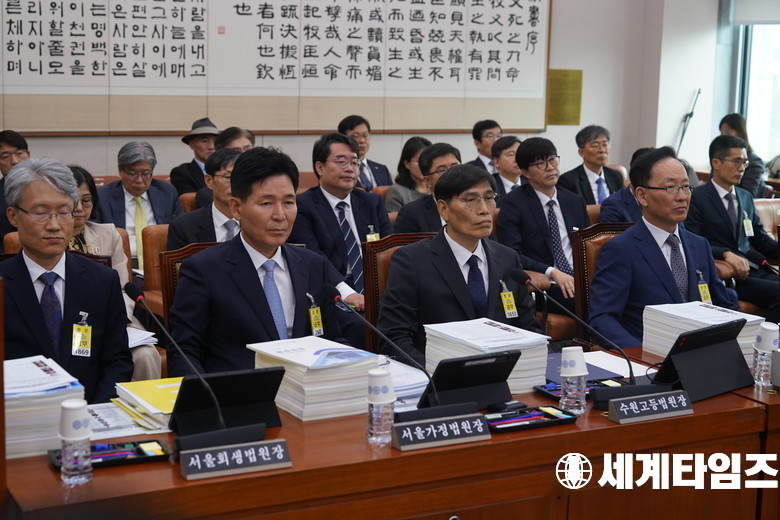 '김대웅' 서울고등법원 법원장을 비롯한 서울 및 수도권 지방법원장들이 20일 서울 여의도 국회에서 열린 2025년도 법제사법위원회 국정감사에 기관 증인으로 출석했다.