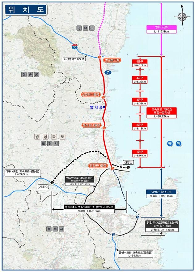 아울러, 동해안 주요 관광지(강구항, 장사해수욕장, 영일대 해수욕장 등)와 포항‧영일만항‧블루밸리 국가산단 등 산업‧물류 거점이 고속도로망으로 연결되어 동해안권 물류‧산업‧관광 활성화가 기대된다.