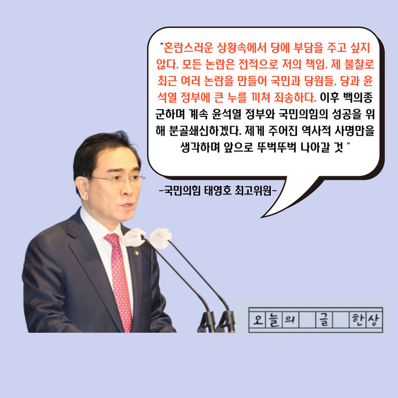 마지막으로 태 의원은 "이후 백의종군하며 계속 윤 정부와 국민의힘을 위해 분골쇄신하겠다. 지켜봐달라. "며 "제게 주어진 역사적 사명만을 생각하겠다"고 덧붙였다.