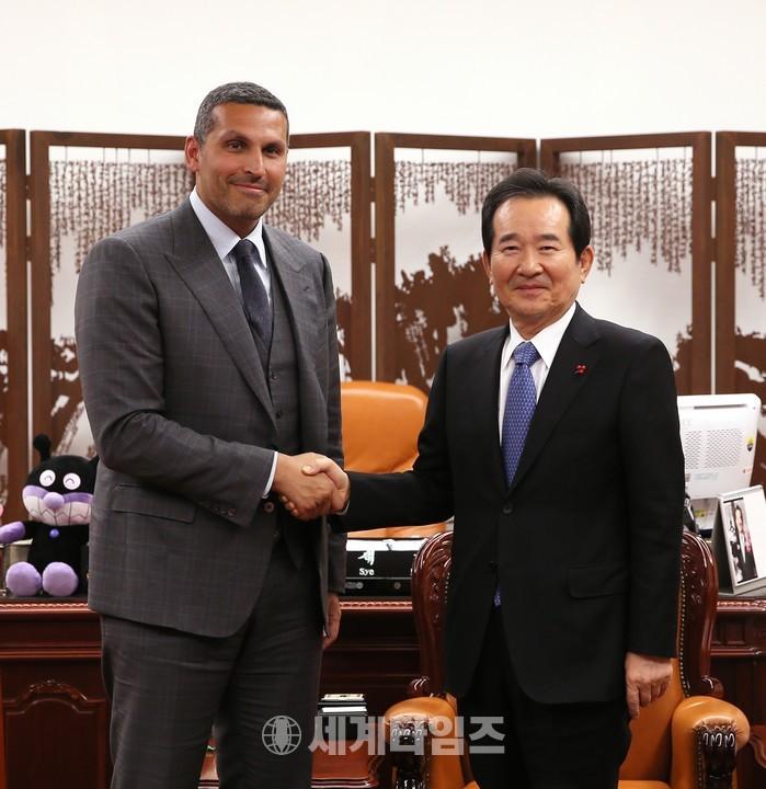 [세계타임즈 이채봉 기자]정세균 국회의장은 1월 8일(월) 오후 3시 국회의장 집무실에서 칼둔 칼리파 알 무바락(Khaldoon Khalifa Al Mubarak) UAE 아부다비 행정청장의 예방을 받았다.