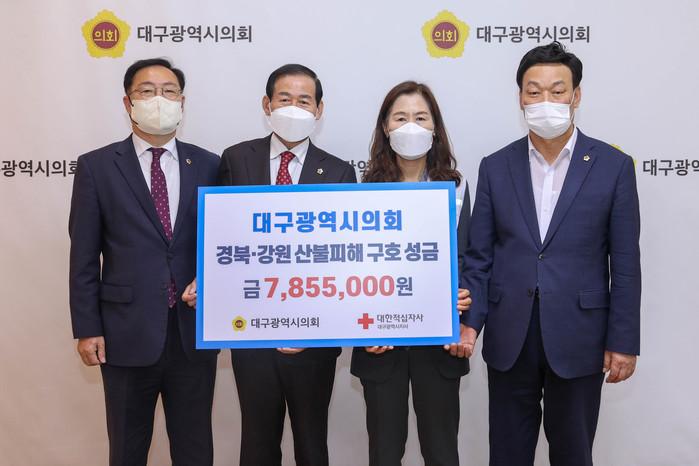 장상수 의장은 “갑작스러운 산불로 삶의 터전을 잃은 경북·강원 지역 주민들에게 조금이나마 용기를 드리고자 대구시의원과 직원들이 한결 같은 정성으로 성금을 마련했다”며,“피해 복구가 조속히 마무리 되어 지역 주민들이 하루 빨리 일상으로 돌아갈 수 있기를 간절히 바란다”고 말했다.