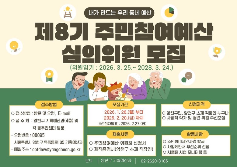 - 제안사업 발굴부터 심의, 우선순위 선정, 모니터링까지 정책 추진 전 과정 참여 [양천구 세계타임즈=이장성 기자] 양천구(구청장 이기재)는 주민의 아이디어가 예산에 반영되고 실제 사업 실행으로 이어지는 ‘주민참여예산제도’를 함께 이끌어갈 ‘제8기 주민참여예산 심의위원’을 2월 20일까지 모집한다고 밝혔다.