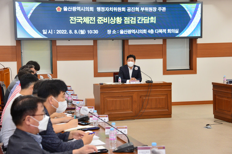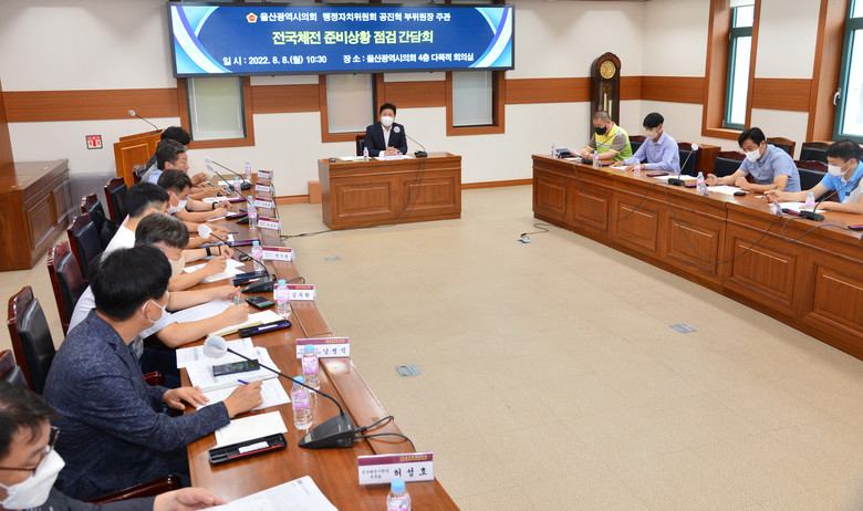 [울산 세계타임즈=이호근 기자] 울산광역시의회 공진혁 행정자치위원회 부위원장은 8월 8일 오전 10시 30분, 시의회 4층 다목적회의실에서 제103회 전국체육대회와 제42회 전국장애인체육대회 준비상황에 대한 간담회를 가졌다.