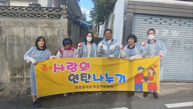 이날 행사는 대흥동 바르게살기위원회 회원 10명이 참여하여, 따뜻하게 겨울을 보내기 바라는 마음으로 동절기에 연탄을 사용하는 관내 2개 가구를 대상으로 총 1,000장의 연탄(가구당 500장, 90만원 상당)을 전달했다.