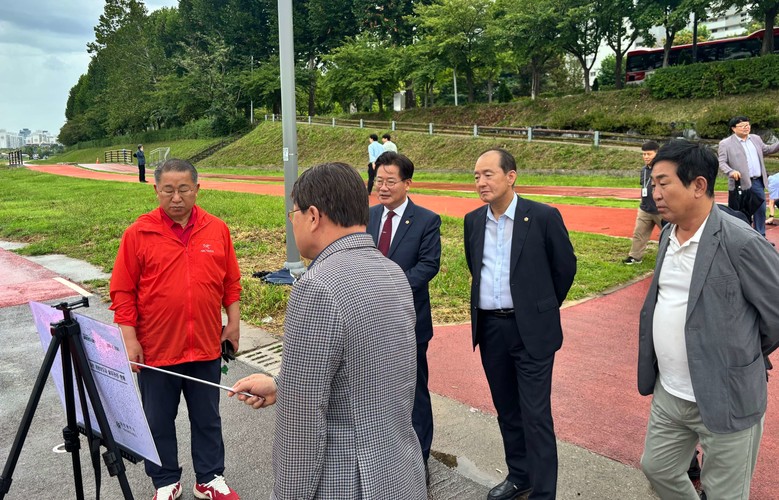 이어서 집중 호우시 안전난간, 데크 등 시설물이 반복적으로 파손 및 부식되어 이용 시민들의 불편이 큰 갑천 경관보도교를 방문했다. 이 자리에서는 하천관리사업소장으로부터 현황 설명을 청취하고, 보도교의 지속적인 파손을 방지하기 위해서는 물에 강한 철근 콘크리트 교량으로의 재설치가 필요하다는 데 공감했다. 아울러, 이용 시민 불편 최소화와 안전에 각별히 힘써 줄 것을 당부했다.