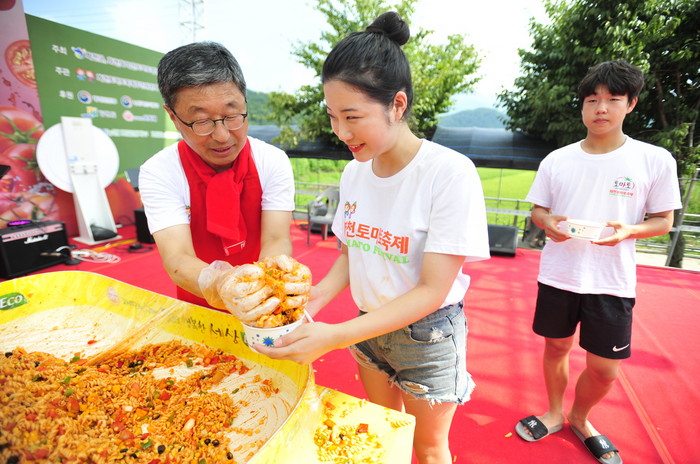 2018 화천토마토축제 이틀째인 3일 사내면 문화마을에서 열린 '천인의 식탁' 이벤트에서 지순식 화천부군수가 관광객들에게 파스타를 나눠주고 있다. 이번 행사는 (주)오뚜기 후원으로 진행됐다.