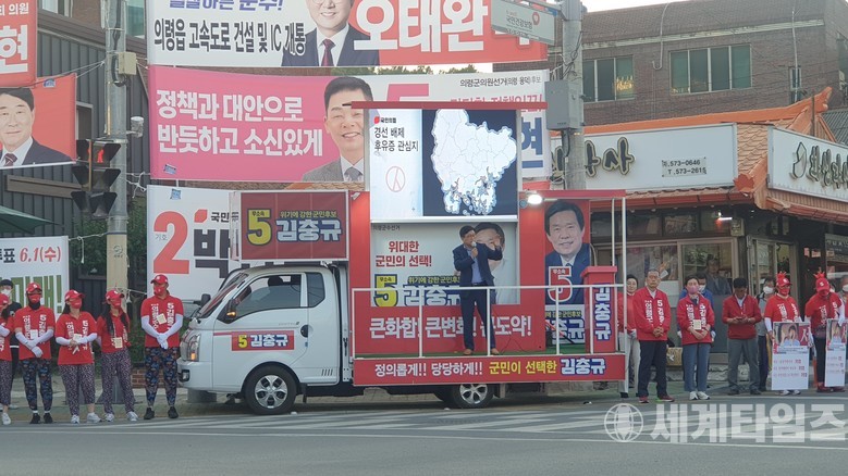 [세계타임즈 = 이판석 기자] 무소속 김충규 경남 의령군수 후보가 6.1 지방선거운동  마지날인 31일 의령읍 군청앞 사거리에서 파이널 유세를 하고 있다.