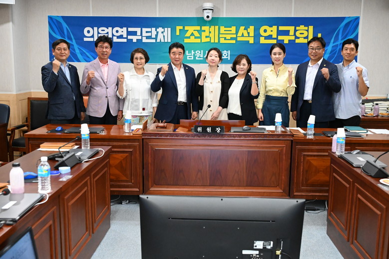 남원시의회 의원연구단체‘조례 분석 연구회’는 현행 남원시 조례의 법령 적합성을 검토하여 조례의 제정·개정·폐지를 요하는 조례들을 정비하여 탄탄한 자치법규 기반을 조성하자는 목표로 2023년 3월 24일 시의회 3층 자치행정위원회 회의실에서 발족했다. 해당 연구단체는 오창숙 의원을 대표의원으로 김길수, 김영태, 김한수, 손중열, 윤지홍, 이미선, 이숙자 의원이 함께 활동한다. 3월 24일 발족식 및 간담회를 개최한 이후 6월 2일 조례분석에 대한 중간보고회를 갖고 7월 18일 지방정책연구원인‘나라살림연구소’와 함께 진행한 최종 연구용역을 통해 총 7건의 신규 제정 조례(안)를 발굴하였으며 자치행정위원회 총 7건, 경제산업위원회 총 4건의 각 상임위원회 소관 조례의 개정이 필요하다는 잠정적 결론을 도출하였다. 위 연구단체 소속 의원들은 687개에 달하는 남원시 자치법규정비와 개선을 위하여 시민들의 요구와 남원시 행정의 운영이라는 각 면을 반영하여 조례 정비를 하고자 그 뜻을 모아 지속적인 활동을 해오고 있다.