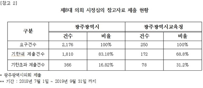 그럼에도 불구하고 2018년 6.13 지방선거 이후 15개월 동안 광주시에 요구한 자료 2,176건 중 날짜를 지켜서 제출한 비율은 83%인 1,810건 뿐이었고, 교육청에 요구한 250건 중 제출 날짜를 지킨 비율은 68%인 172건 밖에 되지 않았다.[참고 2]