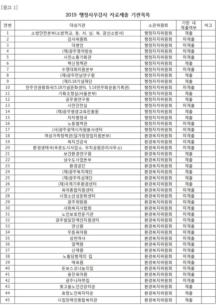 4개 상임위별로 기한 내 미제출된 내역을 살펴보면 ▲행정자치위원회 17개 기관 중 9곳 미제출 ▲환경복지위원회 29개 기관 중 19곳 미제출 ▲산업건설위원회 18개 기관 중 4곳 미제출 ▲교육문화위원회 21개 기관 중 13곳이 기한 내 미제출 하였다. 기한을 넘겨서 감사자료를 제출한 45개 기관 중 자료가 늦은 것에 대해 어떠한 사유도 밝히지 않았다.[참고 1]