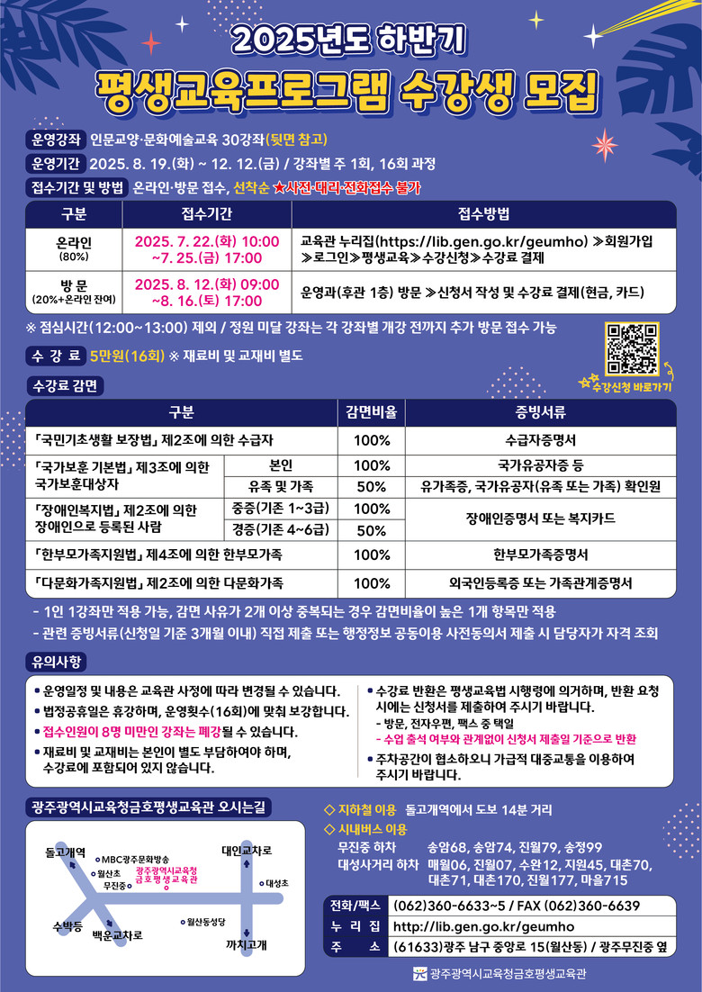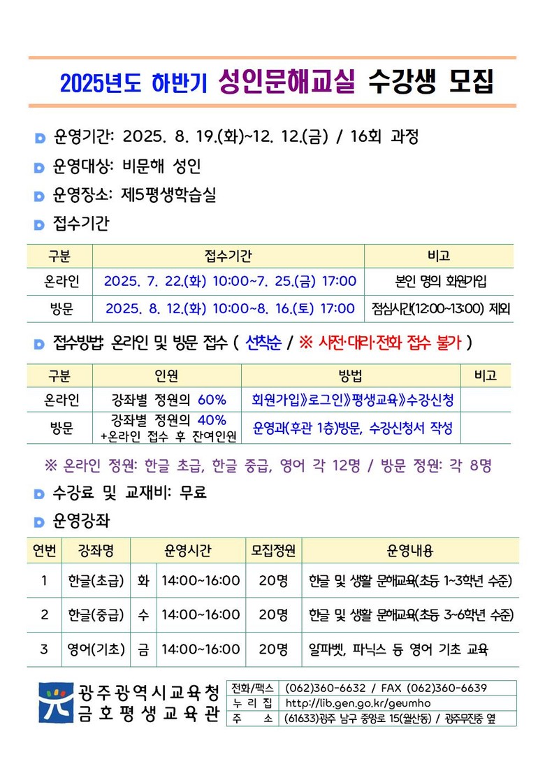 자세한 내용은 금호평생교육관 누리집 또는 운영과(062-360-6632~5)에서 확인할 수 있다.