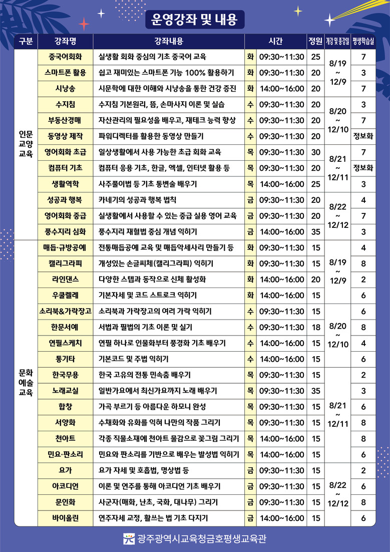 수강 신청은 오는 22~25일에는 금호평생교육관 누리집(https://lib.gen.go.kr/geumho)을 통해 온라인 접수할 수 있으며, 8월 12~16일에는 운영과로 방문 접수하면 된다.