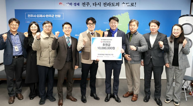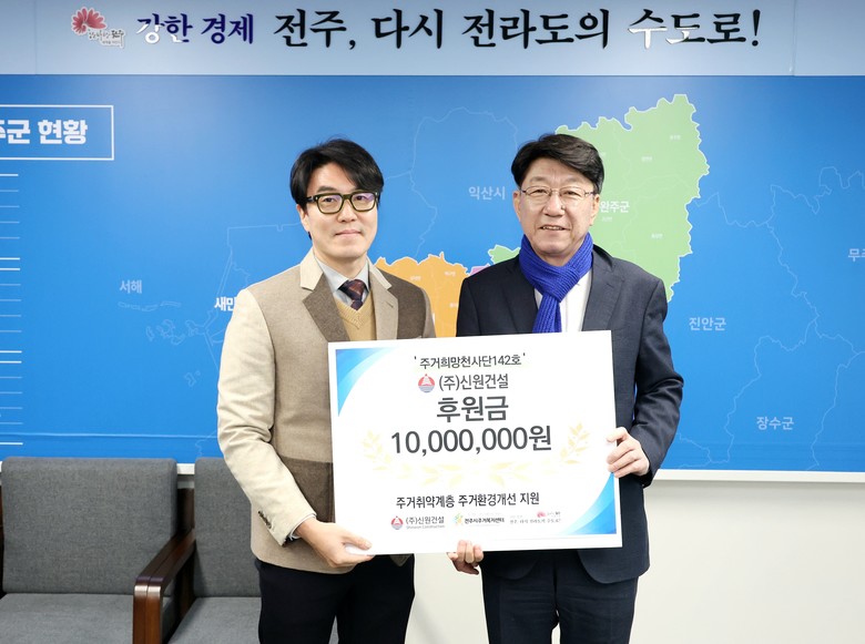 ㈜신원건설은 9일 전주시를 찾아 주거 취약계층의 주거 환경개선을 위한 후원금 1000만 원을 전달하고, 민간 후원 캠페인인 ‘주거 희망 천사단’의 142호 천사로 가입했다.