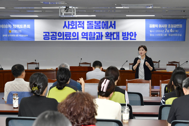 [광주 세계타임즈=손권일 기자] 광주광역시의회 박미정(더불어민주당,동구2) 의원은 4일 광주시의회 예산결산특별위원실에서 김용익 (재)돌봄과미래 이사장을 초대해 ‘사회적 돌봄에서 공공의료의 역할과 확대방안’ 이란 주제로 강연회를 개최했다.