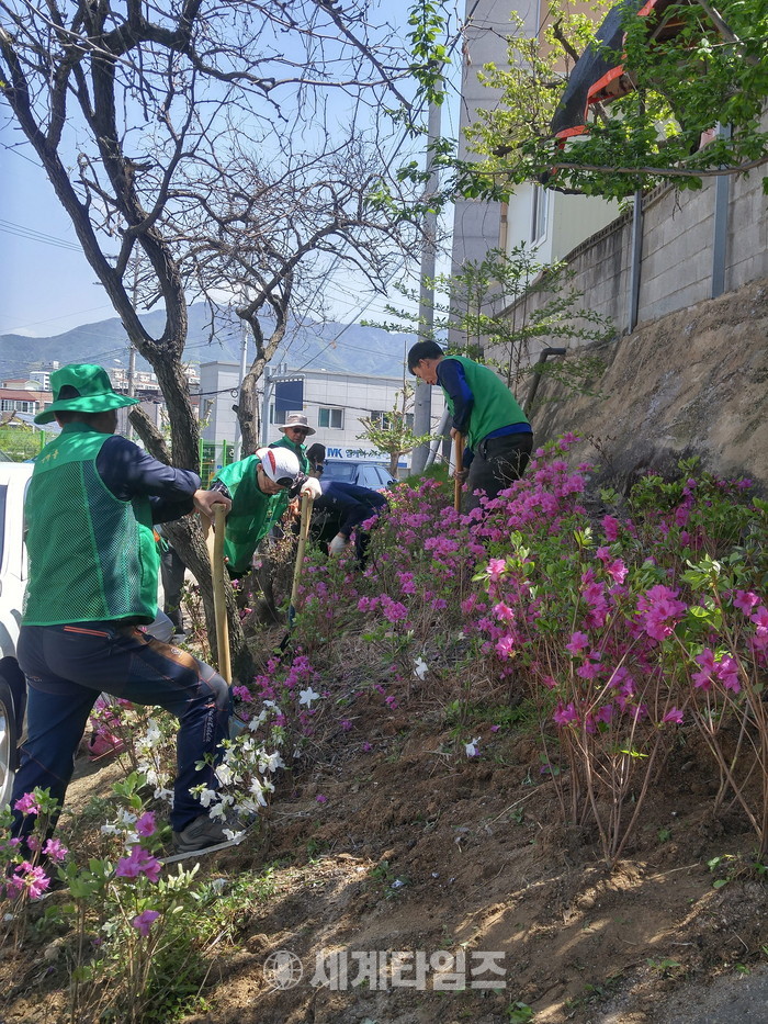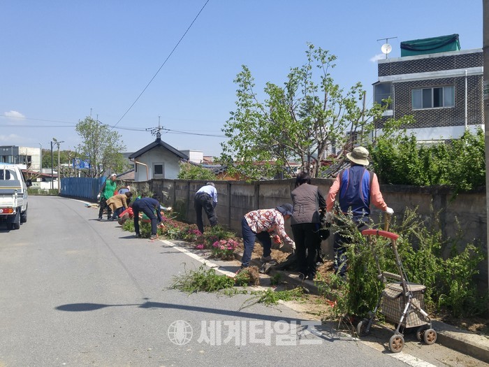 [충주=세계타임즈 이현진 기자] 2017년 도민참여 행복정원사업에 참여하고 있는 충주시 지현동 행복경로당 회원들이 27일 마을안길 행복정원에 철쭉과 황매화, 눈주목, 리라칸사 등 2천여 본의 꽃묘를 식재하며 구슬땀을 흘렸다.