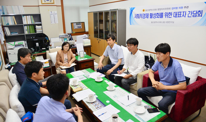 [울산=세계타임즈 이호근 기자] 울산시의회 김미형 행정자치위원은 19일 15시부터 시의회 2층 의원연구실에서 울산 예비사회적기업 나인도어스 대표 이승근, 울산장애인 자립지원 협동조합 새차랑 총괄이사 이광열, 사회적기업 나비문고 대표 이영도, 사회적기업 우시산 대표 변의현, 사회적기업 희망을키우는일터 상임이사 김용식, 남구 친환경급식지원센터 팀장 권병규 등 사회적경제 관계자 6명과 사회적경제 활성화를 위한 간담회를 개최했다.