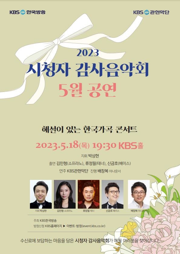 KBS가 오는 5월 18일 목요일 저녁 7시 30분 여의도 KBS홀에서 '2023 시청자 감사음악회'KBS관현악단 5월 공연 ‘해설이 있는 한국가곡 콘서트’를 개최한다.