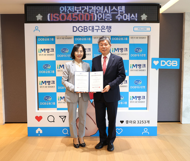 황병우 은행장은 “기업의 주요 화두 중 하나인 안전보건경영은 ESG경영의 일부로 금번 인증 획득을 통해 근로자와 고객이 안전한 DGB대구은행이 되도록 노력하겠다”고 말하면서“근로자와 고객이 안전한 기업 만들기에 만전을 기해 지역 대표기업의 사회적 책임을 다하겠다”는 뜻을 밝혔다.