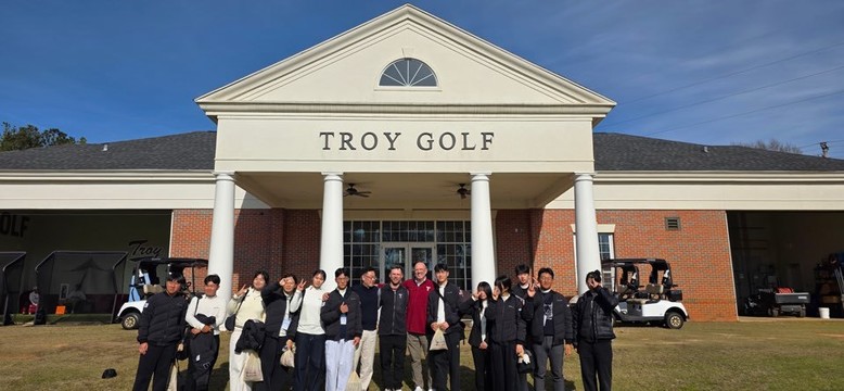 | ▲ 함평골프고 학생들이 미국 트로이대학교 방문을 기념해 단체사진을 촬영하고 있다. |