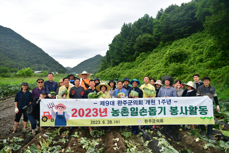 지난해 7월 ‘군민과 소통하는 의회, 더불어 발전하는 완주’라는 슬로건으로 개원한 제9대 완주군의회 서남용 의장을 비롯한 11명의 의원들과 의회사무국 직원 30여명은 형식적인 1주년 기념식 대신 일손부족을 겪고 있는 농가를 찾아 출하를 기다리는 양배추 수확에 구슬땀을 흘렸다.