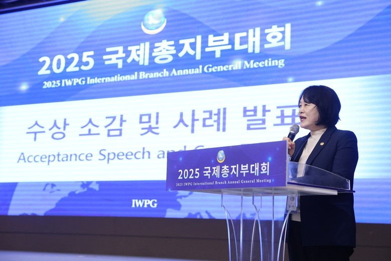 ▲임미숙 ㈔세계여성평화그룹(IWPG) 글로벌 9국장이 21일 대구 중앙컨벤션센터에서 열린 ‘2025 국제총지부대회’에서 우수 글로벌국 수상 소감을 발표하고 있다. (제공: IWPG)