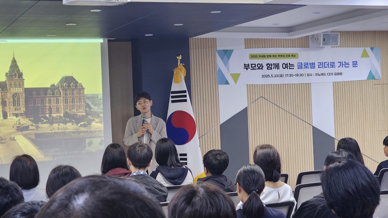 이날 강연은 전직 구글코리아 전무(현 이노레드 대표) 김태원 강사를 초청하여, ‘현실적 진로 로드맵! 글로벌 리더로 가는 문’을 주제로 진행되었으며, 학생과 학부모 약 100여 명이 함께 자리해 큰 관심을 끌었다.