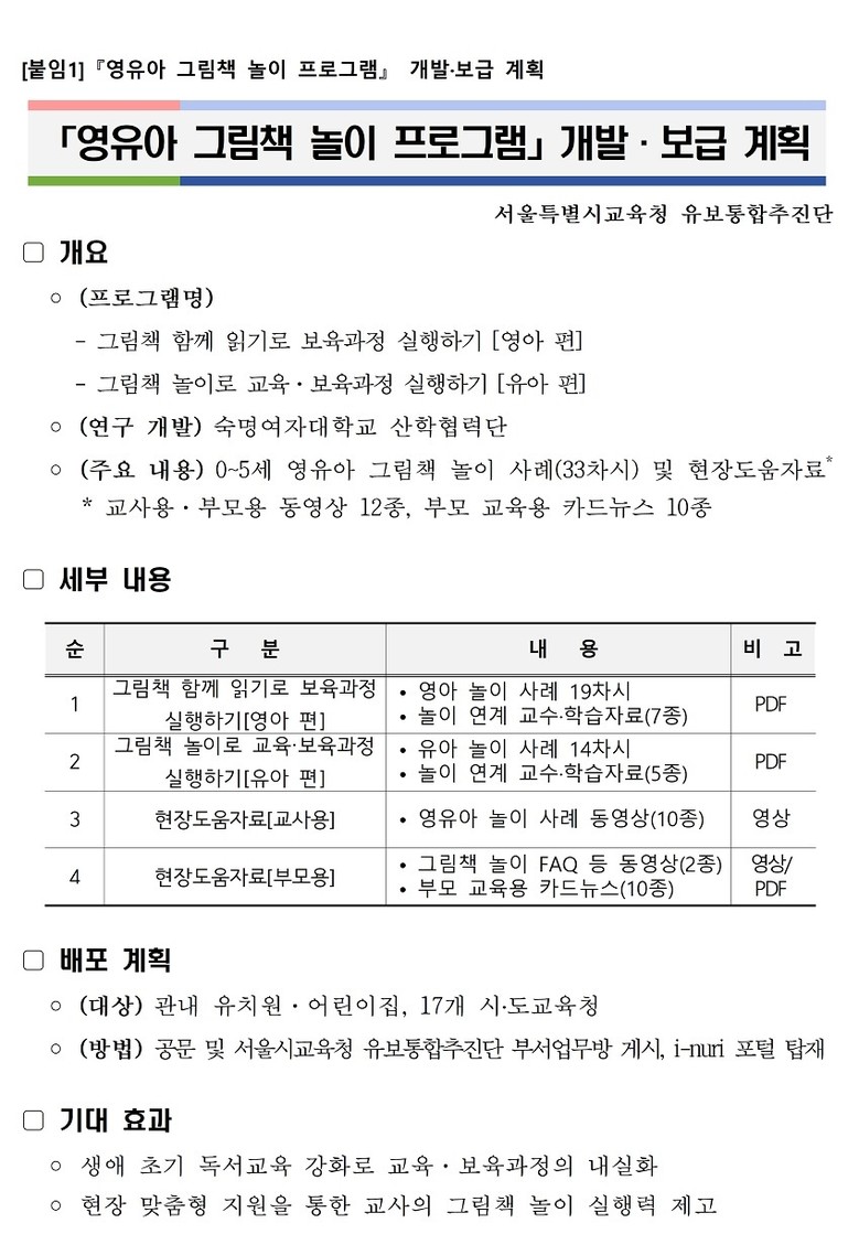 서울시교육청은 이번 프로그램 보급의 실질적인 현장 안착을 위해 0~2세 영아용 책놀이 꾸러미(그림책 5종, 교수·학습자료 7종)를 관내 어린이집 100개 기관에 시범 보급하였으며, 2026년에 약 2,000여 개 기관으로 확대 보급하여 보육과정의 내실 있는 운영을 지원한다.