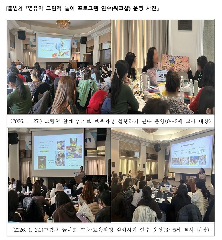 또한, 영유아 교사 200명을 대상으로 그림책 놀이 워크샵을 실시한 결과 현장 만족도가 매우 높게 나타남에 따라, 2026년부터 연수 운영 규모를 확대하여 교사의 그림책 놀이 실행력을 지속적으로 높여 나갈 예정이다.