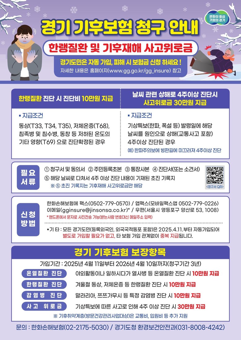 경기 기후보험에 대한 자세한 안내는 한화손해보험(02-2175-5030)과 경기도청 환경보건안전과(031-8008-4242)로 문의하면 된다.