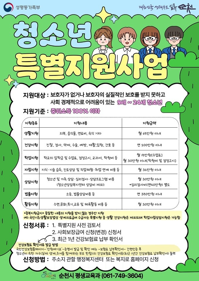 지원 내용은 생활·건강·학업·자립·상담·법률·활동 지원 등이며, 지원 기준은 가구의 중위소득 100% 이하인 청소년이다.