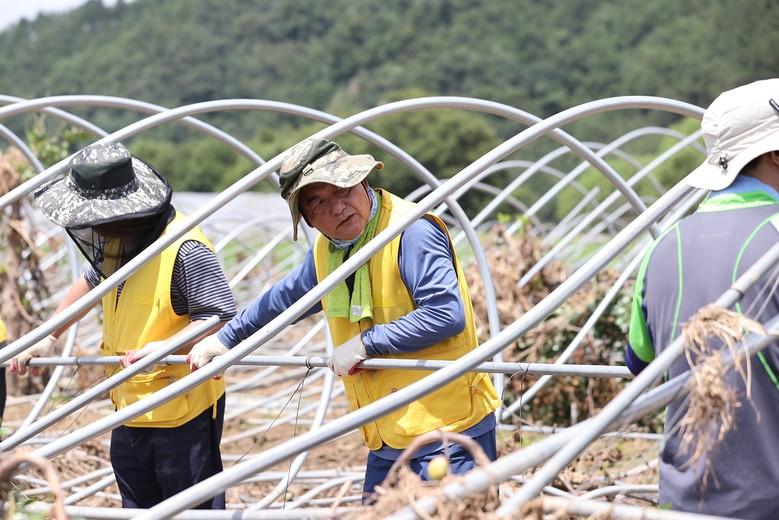 이날 대구시의회 봉사단은 수해 지역 대추나무 농가를 찾아 폭우로 파손된 비닐하우스의 비닐, 철골을 철거하고, 농작물과 토사 등 이물질을 제거하는 등 피해복구에 모자란 일손을 더하고 땀을 흘렸다.